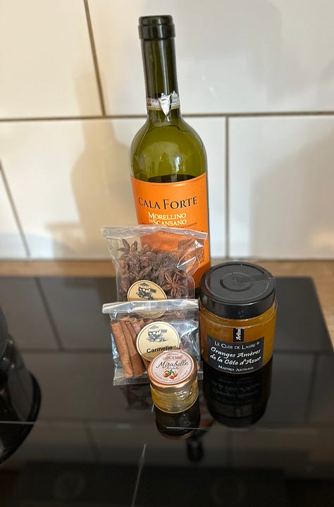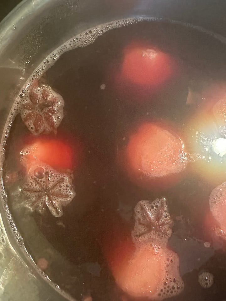 Find small, firm pears. Wash and peel them. Meanwhile, pour an entire bottle of red wine into a saucepan on low heat. Add several star anise, I think I used three. Add cinnamon sticks. I used four. Then, add about three tablespoons of orange marmalade. (I went this route because I bought a gorgeous jar in Menton, and I had no sugar in the house.) Once the marmalade has melted, lower in pears and let them rest in the warm, slow simmering wine hot tub. At some point I had a taste of the broth and found it too bitter, so I added a couple tablespoons of peach jam to sweeten it up. You could absolutely use sugar or honey to sweeten to your preference.