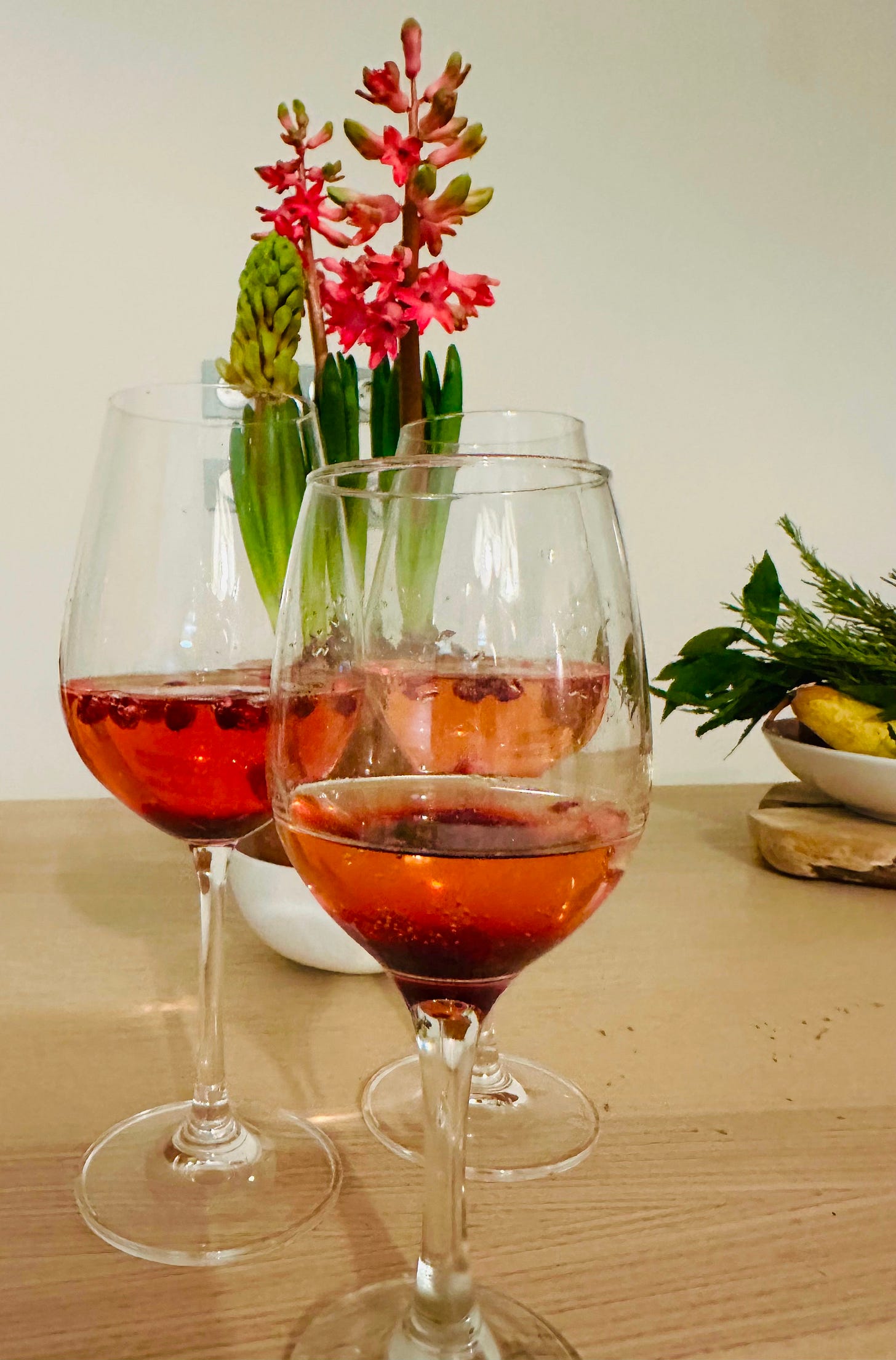 Pour the champagne into tall flutes (we have none here so we used our new wine glasses). Add a tablespoon of the wine syrup and float some pomegranate seeds. Raise your glass to friends and family! Raise your glass to good health and big laughs! Raise your glass to you!!
