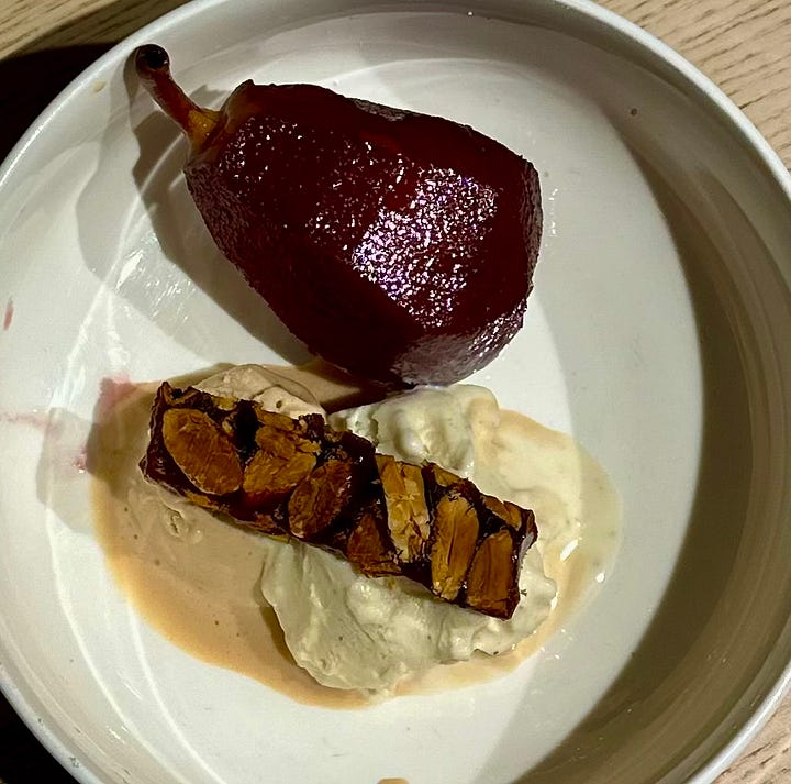For the dessert, arrange the pear in a bowl beside a boule of vanilla gelato. Next, dribble a tablespoon of the wine syrup over the entire project. Place a slice of toasted almond nougat in the dish as well. Chefâs kiss!