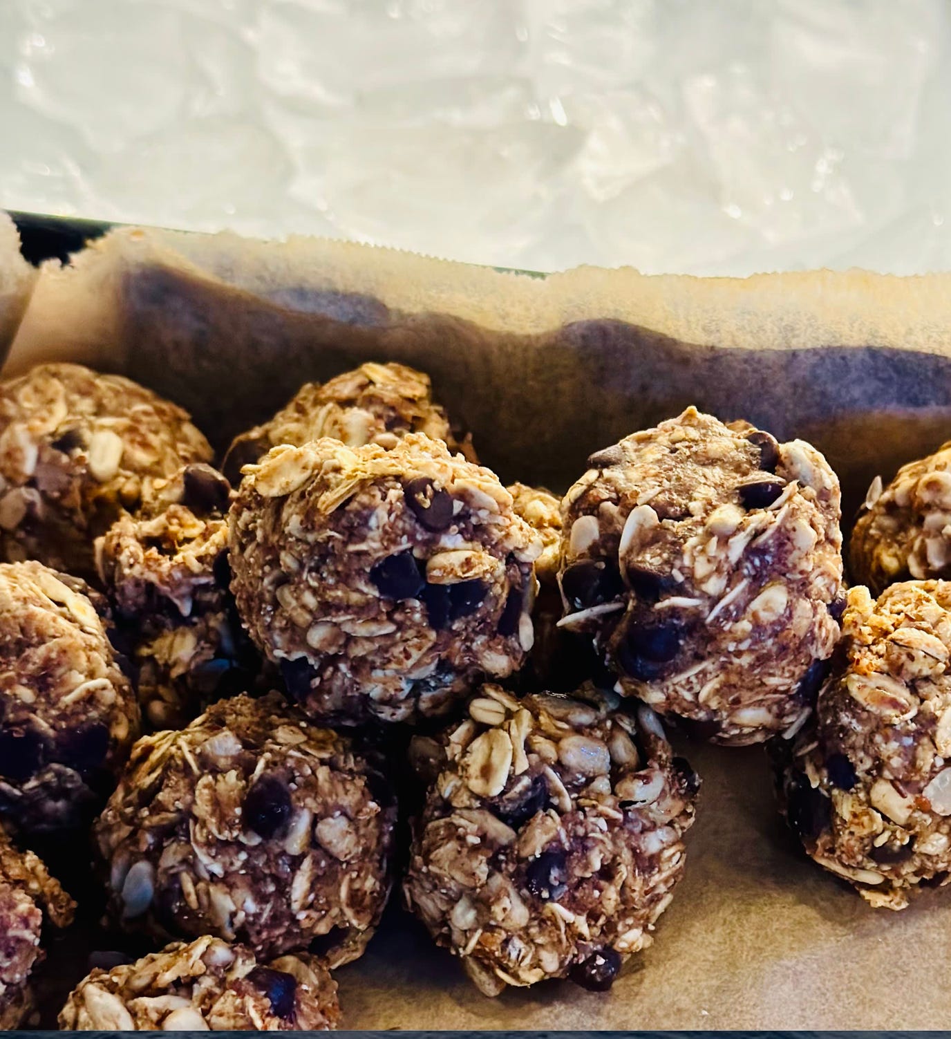 Put all ingredients in a bowl and mix like crazy. Using wet hands, roll them into small balls, about 1 - 2 inches. Crucial that you FREEZE them. And then, eat as needed!