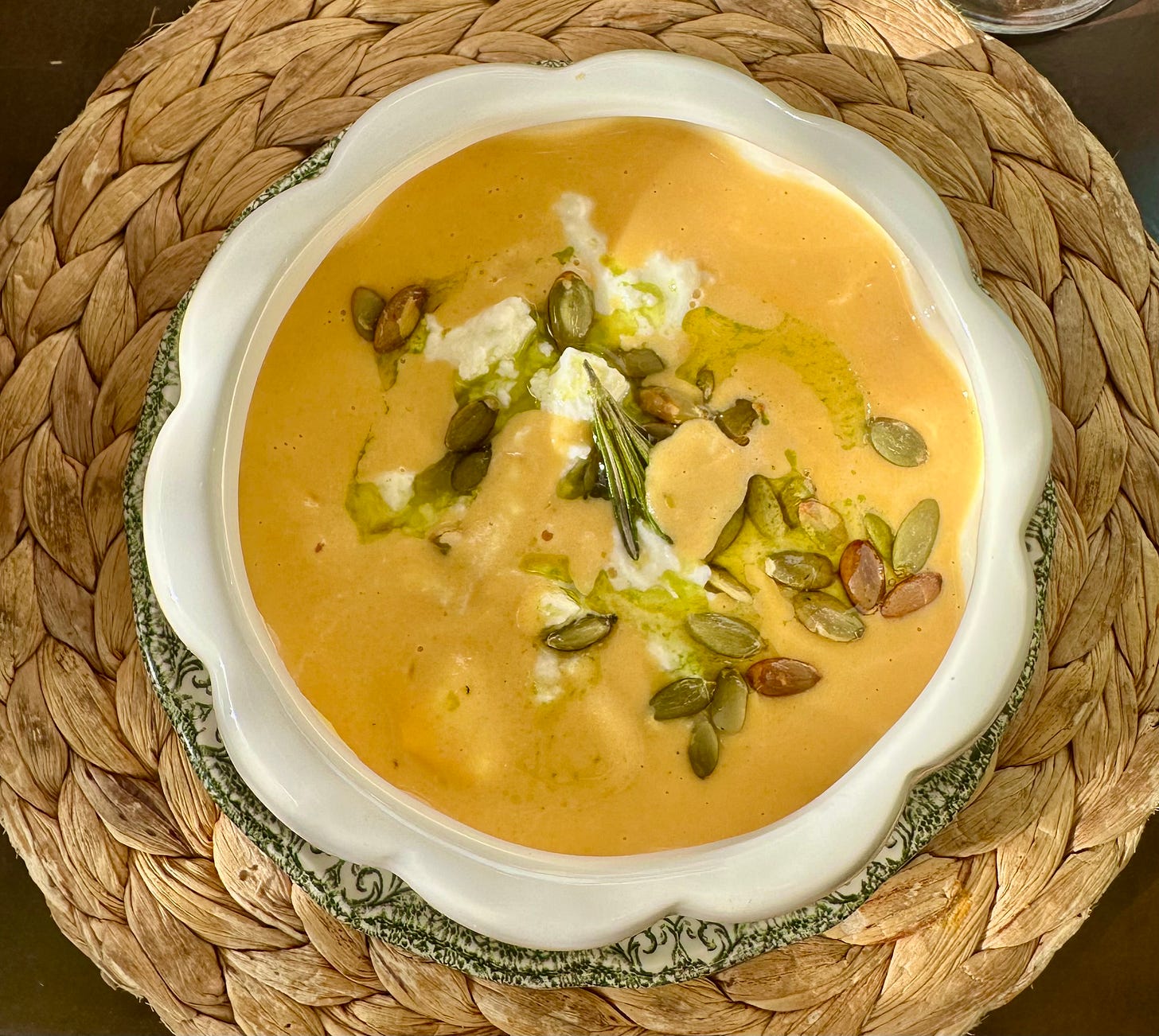 Butternut Squash Velouté w/Feta and Pumpkin Seeds.