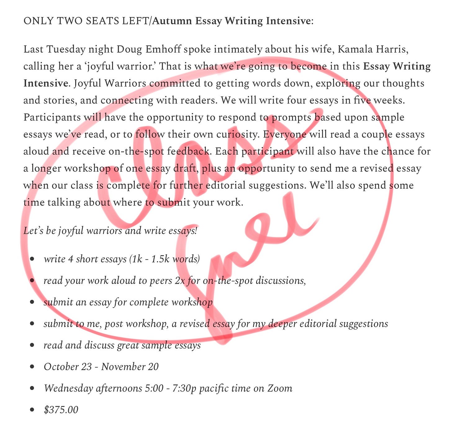 Don’t fret if you missed signing up. Let me know writing essays w/me is something you’d like to do. If we get enough people I’ll run a second session! Save your seat: