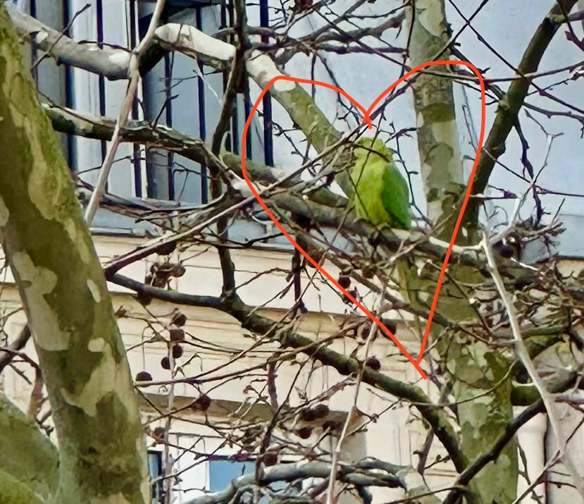 Yes, we saw that green birdâa Rose Ringed African Parakeetâ in Paris! What a surprise! You should have seen us on Les Viaduc des Arts, my husband pointing for meâŠokay, look just to the left of that thick branch, see the window box, now lift your eyes a tiny notchâŠwe were a bit ridiculous. But what a joy to see and hear the parakeet!