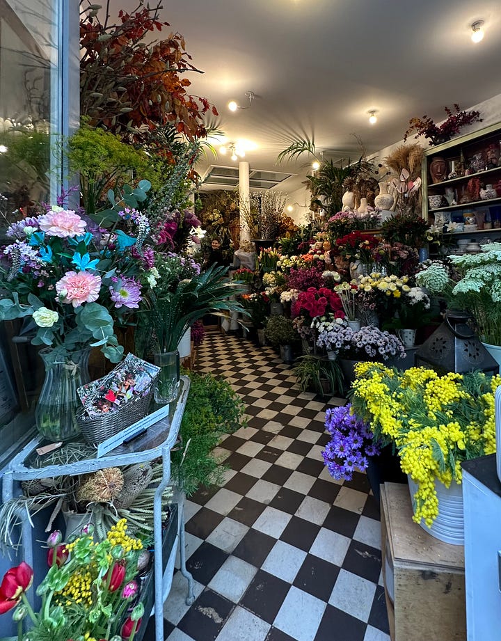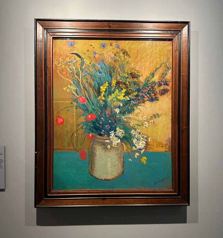 The floor! The fleurs! This painting, Bouquet de fleurs des champs, by Philippe Smit. I love the way the flowers are clumped together in the painting, and the gold and green? Chefâs kiss.