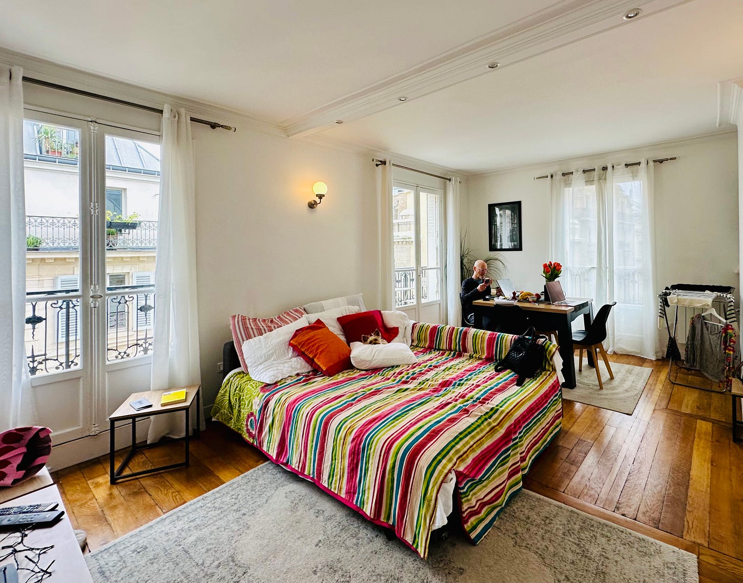 We’ve given up on la chambre, opened up the sofa and are living in le salon. It’s bright and wonderful and at night it feels as if we are having a sleepover.
